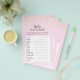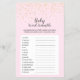Este juego de rayado de palabras para bebés de Baby Shower rosado Gold Confetti es perfecto para una elegante ducha o rociado para un bebé chica. El diseño se compone de confeti de oro falso sobre un fondo rosado y una simple caligrafía gris oscuro. LLAVE DE RESPUESTA: 1. téter, 2. bassinet, 3. fórmula, 4. manta, 5. cuna, 6. pañal, 7. móvil, 8. botella, 9. pacificador, 10. pato de goma, 11. animal relleno 12. termómetro, 13. trona alta, 14. tabla cambiante, 15.