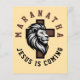 Maranatha Jesús viene, este diseño cristiano presenta una cabeza masculina de león con una cruz y un texto que dice: "Maranatha, Jesús viene".
