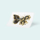 Mariposa de flor dorada con orquídea de joyería negra, decorada con hojas doradas sobre fondo blanco.