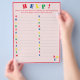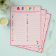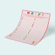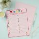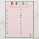 El diseño presenta un fondo rosa pálido en un borde rojo brillante y texto. "¡AYUDA!" se muestra en la parte superior en colores brillantes. Las direcciones son personalizables para un toque más personalizado, si lo desea. Se pide a los invitados que enumeren los nombres de las niñas a partir de la carta mostrada. También disponible en azul. Diseñado para coordinar con la "colección ABC Baby Shower y Nursery".