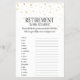 Este juego de refrigerio de palabras de retiro Gold Confetti es perfecto para un fiesta jubilatorio elegante, o cualquier evento o celebración especial. El diseño se caracteriza por un confetti de oro falso con caligrafía gris oscuro sobre un fondo blanco. CONTESTA CLAVE: 1. jubilación, 2. jubilado, 3. senior, 4. libertad, 5. medicare, 6. seguridad social, 7. viajes, 8. vacaciones, 9. tamaño reducido, 10. tiempo libre, 11. años dorados, 12. bingo, 13. voluntario, 14. relajación, 15. aburrimiento