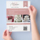 Muestra tu estudio de pasteles con elegancia y estilo. Este folleto de diseño profesional es perfecto para panaderías de alta gama, artistas de pasteles y estudios de postres boutique. Personalízalo con sus propias tres imágenes para que aparezcan sus mejores pasteles personalizados, agregue su nombre de negocio, detalles de contacto y un lema que refleje su marca. Incluye espacio para un código QR para que los clientes puedan reservar fácilmente una cita, acceder a su sitio web, formulario de pedido o medios sociales. Ideal para diseñadores de pasteles bodas, pasteles de celebración premium y negocios de pasteles modernos que valoran la calidad, el diseño y los detalles.