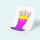 Un pastel de cumpleaños gigante con glaseado rosa y amarillo que gotea y velas azules encendidas.