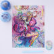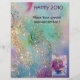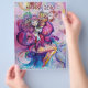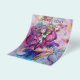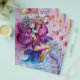 Colorido, caprichoso, divertido payaso rosa tocando la corneta con un búho expresivo y notas musicales alegres, flores, hojas en colores vibrantes rojo, fucsia, violeta, púrpura, azul, blanco, pintura de acuarela de Bulgan Lumini (c)