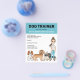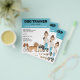 Diseñado con entrenadores de perros y mascotas en mente presentando el ilustracion original de Destei de feliz personalizado de brunette chica junto con cuatro perros, incluyendo un blenheim Cavalier King Charles Spaniel, una miniatura de albaricoque Goldendoodle, bulldog francés peinado y un cabello suave negro y marrón Dachshund. El chica está usando jeans azules y una camiseta blanca. Su largo pelo castaño se pone en una cola de caballo y tiene una expresión amistosa sonriente en la cara. El diseño tiene varias áreas de texto personalizables para información y detalles de negocios. Diseño atractivo y bonito para promocionar el negocio relacionado con el perro, con obras de arte únicas de Destei.