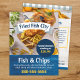 Este llamativo volante es perfecto para enviarle o entregarle para promocionar su negocio de fish and chips. Con un fondo rústico de madera azul, apetitosas fotos de fish and chips crujientes y una paleta de azul marino, captura el encanto costero de su marca. Personalizable completo, es una excelente manera de mostrar su menú, la oferta especial burbuja en la parte delantera y los detalles de negocios en un formato elegante y profesional.