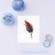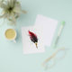 Pluma de fuente antigua de dibujos artísticos adornada con una pluma roja oscura sobre fondo blanco.