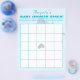 Design features a pale blue background to the image of dainty crocheted baby booties. Name of guest-of-honor is displayed in an elegant ocean blue font above the heading, which is featured in bold. Game directions are displayed below heading in a clear, easy-to-read