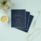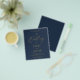 Invitaciones de boda de presupuesto azul marino y dorado con lámina de papel de aluminio falsas para primavera o verano - incluye una tipografía de escritura hermosa y elegante con un color moderno simple y clásico para la celebración del día especial de la boda.