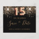 Tenga en cuenta que esta opción Guardar la fecha está en papel de volante y es muy delgada. Los sobres no están incluidos. Para más grueso Guardar la tarjeta de fecha (mismo diseño), por favor visite nuestra tienda. Una chica y de moda Salven la Fecha para una Quinceañera, fiesta de cumpleaños número 15. Un fondo negro decorado con un falso purpurina dorado. Plantillas para una fecha y nombre y texto. Letras de colores dorados. El texto: Save the Date se escribe con un gran guión de estilo escrito a mano.