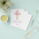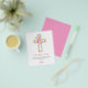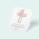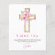 Tarjetas de agradecimiento de Primera Comunión religiosas con flores de rosa pastel rosa, naranja y púrpura, cruz de flores botánicas acuarela.