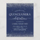 Las invitaciones al partido de celebración Sparkle Girly Quinceanera, Purpurina de Faux Blue Faux de Presupuesto, incluyen una hermosa y elegante tipografía de escritura para la celebración especial de cumpleaños número 15.