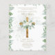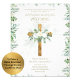 Elegante invitación de boda de fe católica cristiana con campos de plantilla de texto a ambos lados para que incluya la ceremonia de boda, recepción, rsvp, breve programa del día del registro de regalos. Rosas blancas, hojas verdes, invitación decorada con cruz dorada.