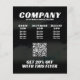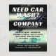 Cubierta de lavado de coche con imagen dinámica de salpicadura de ola de agua y coche de lujo. Incluye lista de precios, descuentos promocionales y espacio para código QR.