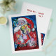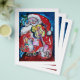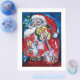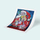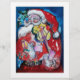 Colorido, caprichoso y artístico cuadro de acrílico, Santa está tocando violín en la nevada noche de invierno, búho, ornamentos florales, plantas de invierno, bayas huecas de colores vivos rojos, verdes, blancos, azules, amarillos.