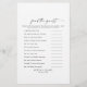 Esta escritura moderna de la tarjeta de juego Find The Guest boda es perfecta para una boda minimalista. El sencillo diseño en blanco y negro presenta una tipografía industrial única con un estilo boho moderno. Personalizable de cualquier color. Mantenga el diseño minimalista y elegante, tal como está, o lo personalice añadiendo sus propios gráficos y obras de arte. Personalice la tarjeta con los nombres de la novia y el novio y la fecha del boda. Puede personalizar las preguntas del juego haciendo clic en el botón "personalizar".