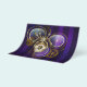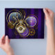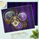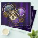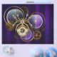 Araña de acero de oro y acero con relojes antiguos decorados con artes dorados sobre el fondo morado, rayado, texturado con lentes y engranajes de latón. Estilo Steampunk.