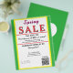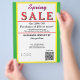 Jewelry or any business type supplies. Bright springtime yellow and green background. Insert Sale price and date details. Upload Your Logo, or delete to leave area blank. Insert Name and Website or other contact QR Code. Spring written in pink script. Sale written in large red typography. Thank You is written inside large white heart on backside. Original Design by TamiraZDesigns.