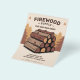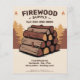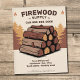 A professional flyer featuring stacks of neatly arranged split logs in rich brown and amber tones, a subtle forest scene with warm autumn colors, and small flame icons accent.