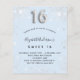Tenga en cuenta que esta invitación está en papel de volante y es muy delgada. Los sobres no están incluidos. Para invitaciones más gruesas (el mismo diseño) visite nuestra tienda. Una invitación moderna, elegante y glamurosa para una fiesta de 16 y 16 años de chica. Un fondo azul cielo, decorado con purpurinas de plata falsas, chispas. Personalice y agregue su nombre y detalles del fiesta. El número 16 se escribe con un tipo de letra, guión.