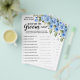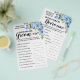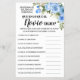 Flores azules ¿Qué dijo el novio? Juego para ducha nupcial en inglés y español incluido (parte frontal y trasera). Cambie la redacción del diseño para las versiones en inglés y español. Para personalización adicional (cambiar la pregunta y otras palabras, color de fuente, estilo de fuente), haga clic en personalizar, desplácese hacia abajo y haga clic en el enlace "haga clic para personalizar aún más".