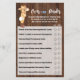 Juego de Baby Shower Little Cowboy Over o Under. Cambia la letra del diseño. Para cambios adicionales (color de fuente, estilo de fuente, eliminar o mover elementos), haz clic en personalizar, desplázate hacia abajo y haz clic en el enlace "Editar usando la herramienta de diseño". ** El fondo de madera está incrustado en el diseño para ser impreso en papel blanco. ** - Revisa la colección para encontrar todos los diseños coincidentes - CÓMO JUGAR: Los invitados adivinan si creen que el número en cada afirmación es superior o inferior