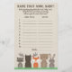 Utilice nuestro juego "adivina la canción del bebé" con tema de bosque para jugar una actividad divertida e interactiva con los invitados de tu ducha de bebé. Crea una lista de reproducción de diez canciones que incluyan la palabra "bebé" y reprodúcelas para tus invitados para que adivinen el título y el artista de cada canción. Los animales del bosque incluyen un zorro, un alce, un conejo, un mapache y un oso.
