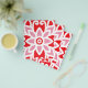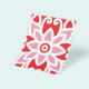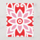El diseño presenta un patrón simétrico con una combinación de colores rojos y blancos. En el centro, hay un diseño floral estilizado con capas de pétalos irradiando hacia afuera. Alrededor de este motivo central se encuentran elementos giratorios y formas decorativas adicionales, creando un aspecto equilibrado y armonioso. El uso de sólo dos colores hace que el diseño sea muy elegante.