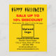 Horror, miedo, espantoso, espeluznante, fantasma, monstruo, cráneo, calabaza y demás. ¡Feliz Halloween! Vacaciones para asustar pero no para asustar a clientes o clientes. Festividad para celebrar este mes de octubre y para anunciar también su negocio. Volante de personalizable con venta de Halloween, su nombre comercial y otra información de su negocio, un material de marketing que puede usar para atraer más clientes. Personalizar y repártelo para atraer a más clientes a que compren sus productos o clientes para que les gusten sus servicios. Los colores de diseño son textos negros y rojos sobre fondo amarillo. Para personalizar de este folleto, especifique el porcentaje de descuento que ofrecerá y las fechas de venta. Sube también el logotipo de tu empresa, escribe tu nombre de negocio, dirección, número de teléfono, correo electrónico y sitio web o tu página de red social de tu empresa. Por favor, compruebe la apariencia en los lados frontal y posterior después de teclear textos y cargar el logotipo. Si la apariencia le resulta agradable, puede realizar su pedido ahora. Si necesita redimensionar y mover los textos y el logotipo para que encajen en este volante o en el tamaño que elija, por favor cambie la herramienta de diseño. También puede cambiar el color de fondo, el color de fuente y el estilo de fuente en la herramienta de diseño. ¡Feliz Halloween! Te deseo más ventas esta fiesta.