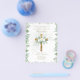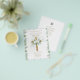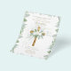 Elegante invitación de boda cristiana, católica, con campos de plantilla de texto a ambos lados para que usted incluya ceremonia de boda, recepción, rsvp, breve orden del programa del día del registro de regalos. Rosas blancas, hojas verdes, invitación con decoración de cruz dorada.