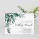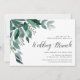 Las elegantes invitaciones botánicas de brunch post-boda cuentan con hojas de eucalipto de color agua y cascada de follaje verde desde la esquina superior izquierda. Personalizar con los detalles del brunch boda alineados a la derecha y adornados con el guión de caligrafía de moda. Las invitaciones se invitan al verde de los bosques sólidos.