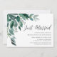 Las elegantes invitaciones botánicas de brunch post-boda cuentan con hojas de eucalipto de color agua y cascada de follaje verde desde la esquina superior izquierda. Personalizar con los detalles del brunch boda alineados a la derecha, adornados con "recién casados" en escritura caligráfica de moda. Las invitaciones se invitan al verde de los bosques sólidos.