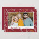 Elegante tarjeta de fotos de Acción de Gracias con tu foto familiar favorita enmarcada en blanco con un fondo de follaje de otoño naranja, blanco y borgoñoso. "Agradecimiento" aparece en un moderno estilo de letra burdeos. Personalice la parte delantera de la tarjeta agregando sus nombres, el año u otro texto. La moderna tarjeta de Acción de Gracias revierte para mostrar tu mensaje personal (opcional) en texto blanco con un fondo de color burdeos.