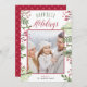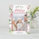 La tarjeta de fotos festiva incluye bayas de color de agua pintadas, hojas y ramas, rodeando tu foto favorita en el centro. "Festividades más felices" aparece en la parte superior en tipografía de bloques con letras rojas y verdes. Personalice el saludo de su personalizado y los nombres que aparecen en la parte inferior.