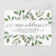 Este moderno cambio botánico de postal cuenta con un marco de abundantes hojas de color verde acuático y algunas bayas diminutas sobre un fondo blanco limpio. Las palabras "nueva dirección" aparecen en caligrafía elegante y rápida. Una invitación sencilla y elegante que se sentirá orgulloso de enviar a amigos y familiares.