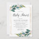 Elegante y elegante ducha de bebé con hojas de acuarela y ramas en vibrantes tonos verde oscuro y verde azulado. Un impresionante marco de Relieve metalizado de oro falso rodea los detalles de la ducha para bebés, para un aspecto perfecto para las duchas de primavera y verano.