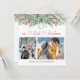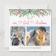 Nuestra Primera Tarjeta Fotográfica De Navidad. Este diseño presenta ilustraciones acuáticos de vegetación y bayas rojas. El texto "nuestra primera navidad" está escrito en estilo caligráfico. Coloque sus fotos a continuación para completarlas.