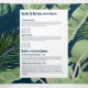Un ilustracion acuarela de hojas tropicales verdes sobre un fondo azul marino oscuro añade una estética de moda a este elegante folleto tridoblado. Un tipo de letra negrita en el frente muestra el nombre de su marca en el fondo oscuro de la portada. Actualice el texto del personalizable para que se ajuste a su marca, y personalice los detalles de todo el folleto para su propio uso. Estos folletos 5x7 son el tamaño perfecto para mostrar las listas de precios y el menú de servicios, o para describir la línea de productos. Una gran pieza de marketing para repartir a los clientes potenciales para que introduzcan rápidamente su negocio. Póngase en contacto con el diseñador para obtener ayuda sobre la composición tipográfica o las variaciones de diseño. Arte y diseño © 1201AM Design Studio | www.1201am.com