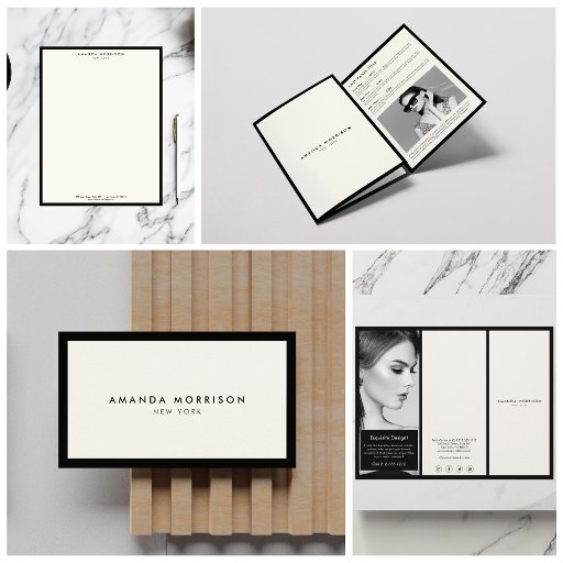 Un diseño elegante y refinado eleva su marca en este folleto profesional tripliego. El nombre o el nombre de la empresa están en la parte delantera, mientras que el marfil y la paleta de color negro mantienen el diseño clásico y limpio. Actualice el texto del personalizable para que se ajuste a su marca, y personalice los detalles y las fotos de stock en todo el folleto para su propio uso. Estos folletos 5x7 son el tamaño perfecto para mostrar las listas de precios y el menú de servicios, o para describir la línea de productos. Una gran pieza de marketing para repartir a los clientes potenciales para que introduzcan rápidamente su negocio. Ideal para ferias, salones, joyerías, pequeñas boutiques, artículos de lujo, realtors y más. Póngase en contacto con el diseñador para obtener ayuda sobre la composición tipográfica o las variaciones de diseño. Arte y diseño © 1201AM Design Studio | www.1201am.com