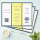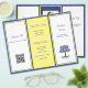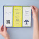 Plantilla de folleto triple plegado en azul oscuro, amarillo y blanco. Incluya una foto personal para la sección "about", un código QR y el logotipo que necesite. La imagen azul del árbol en el panel frontal puede convertirse en tu logotipo. Los colores neutros captan la atención y el trabajo de casi todos los tipos de negocios. Personalizar con texto de cabecera e impresión más pequeña en seis paneles entre dos lados de papel de 8 x 11 pulgadas. Cambiar el tamaño del papel puede alterar el diseño para que no encaje correctamente.