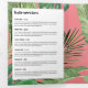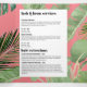 Un ilustracion acuático de hojas tropicales verdes sobre un fondo color salmón añade una estética de moda a este elegante folleto tripliego. Un tipo de letra negrita en el frente muestra el nombre de su marca en el fondo oscuro de la portada. Actualice el texto del personalizable para que se ajuste a su marca, y personalice los detalles de todo el folleto para su propio uso. Estos folletos 5x7 son el tamaño perfecto para mostrar las listas de precios y el menú de servicios, o para describir la línea de productos. Una gran pieza de marketing para repartir a los clientes potenciales para que introduzcan rápidamente su negocio. Póngase en contacto con el diseñador para obtener ayuda sobre la composición tipográfica o las variaciones de diseño. Arte y diseño © 1201AM Design Studio | www.1201am.com