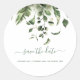 Las hojas verdes salvan el sello para sobres boda de fecha. verde bonito Cambia el pegatina de fechas para finalizar tus invitaciones y enviarlo a tus invitados. Este moderno pegatina Guardar la fecha muestra sus nombres y la fecha de boda con el borde botánico de hojas de color verde bonito y "Guardar la fecha" escrito en un guión elegante verde coincidente. Puede cambiar los colores del texto para que se ajusten a su propio estilo.