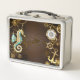 Fondo de madera con caballito de mar mecánico
