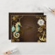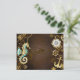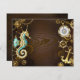 Fondo de madera marrón con mar, cresta mecánica, volante antiguo, ancla dorada y varios engranajes de oro y latón. Estilo Steampunk.
