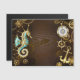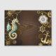 Fondo de madera marrón con mar, cresta mecánica, volante antiguo, ancla dorada y varios engranajes de oro y latón. Estilo Steampunk.