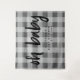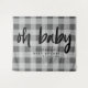 Fondo de decoración moderno para fiesta de baby shower neutral. Patrón de gingham gris en el fondo. El texto dice "oh baby" en letra script moderna. Puedes agregar el nombre de la futura mamá y la fecha del evento. Diseño simple y minimalista.