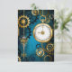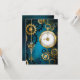 fondo turquesa, texturado, de vapor punk con bronce y oro, llave de plata y reloj. Estilo Steampunk.