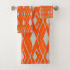 Este conjunto de toallas tiene un diseño Art Deco de formas de diamante gris en un campo de naranja.