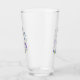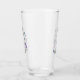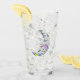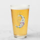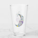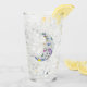 Este vaso de vidrio para bebidas tiene una luna creciente blanca decorada con formas abstractas de colores que incluyen círculos, triángulos y se desplaza en azul, amarillo y morado con una cara con ojos azules en la parte delantera y trasera.