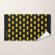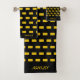 Elegantes formas geométricas doradas sobre el juego de toallas de baño negro. El texto de nombre se puede personalizar.